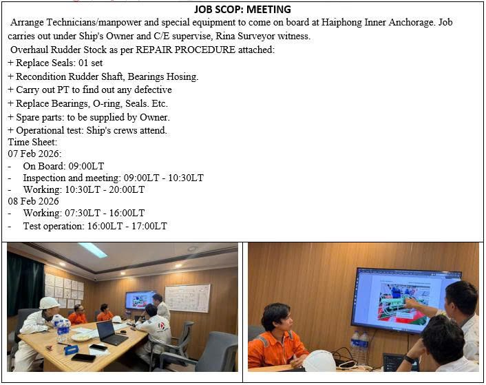 Is your vessel’s upper rudder stock bearing worn out at Cai Mep Port? VietNam Shiprepair Co. provides fast, professional Rudder Stock Bearing Replacement and Marine Services, ensuring safe steering performance. On Feb 06, 2026, we successfully replaced the upper rudder stock bearing on a small tanker at Cai Mep Port under strict RINA surveyor supervision and tight schedule, with zero operational delay. Our Marine Services extend to all ports and anchorages across Vietnam, including Hai Phong, Vung Tau, Nghi Son, and Quy Nhon. All repairs comply with International Association of Classification Societies (IACS) and International Maritime Organization (IMO) standards—learn more at IACS Standards. Trust VietNam Shiprepair for reliable Rudder Stock Bearing Replacement!